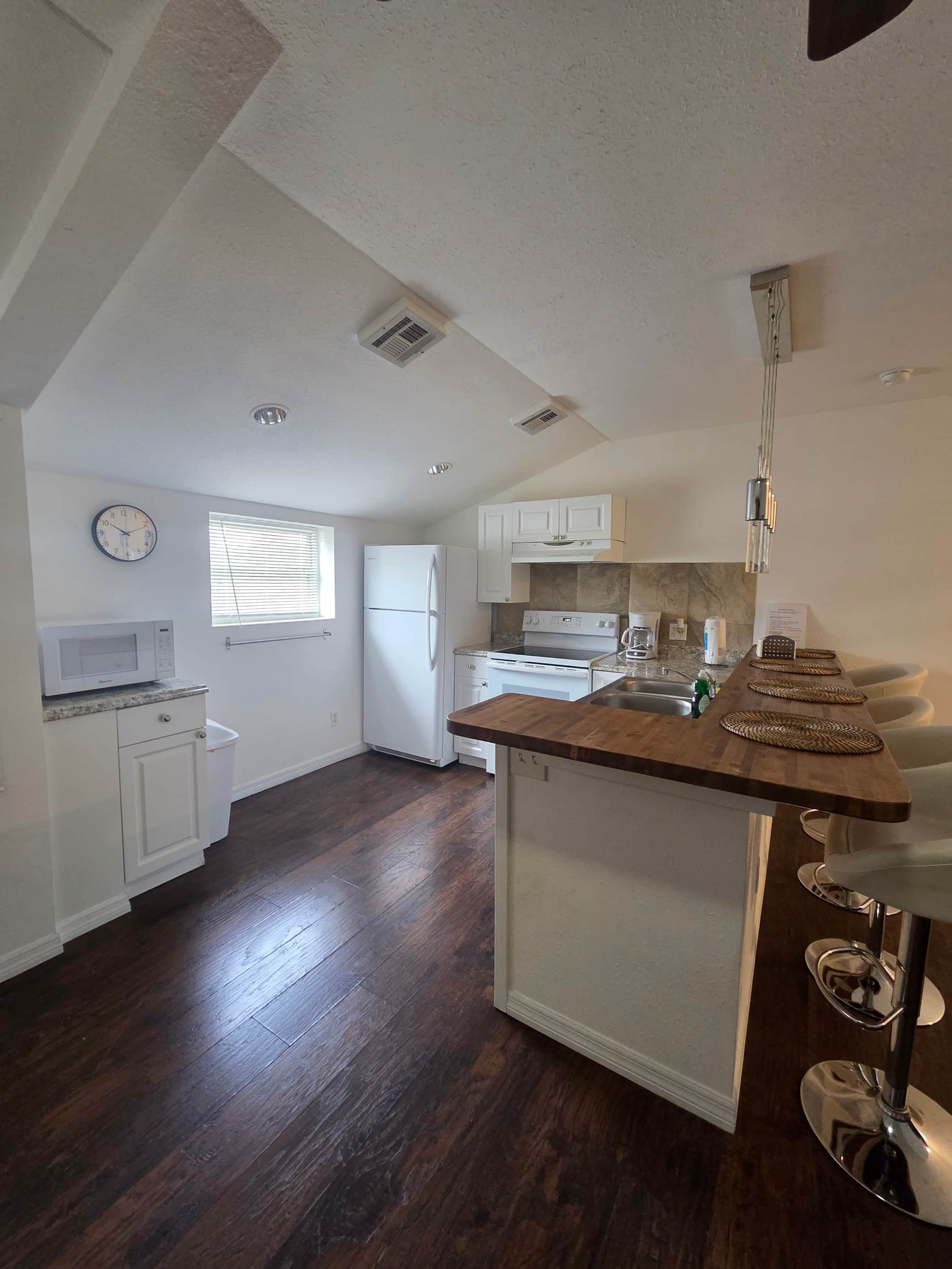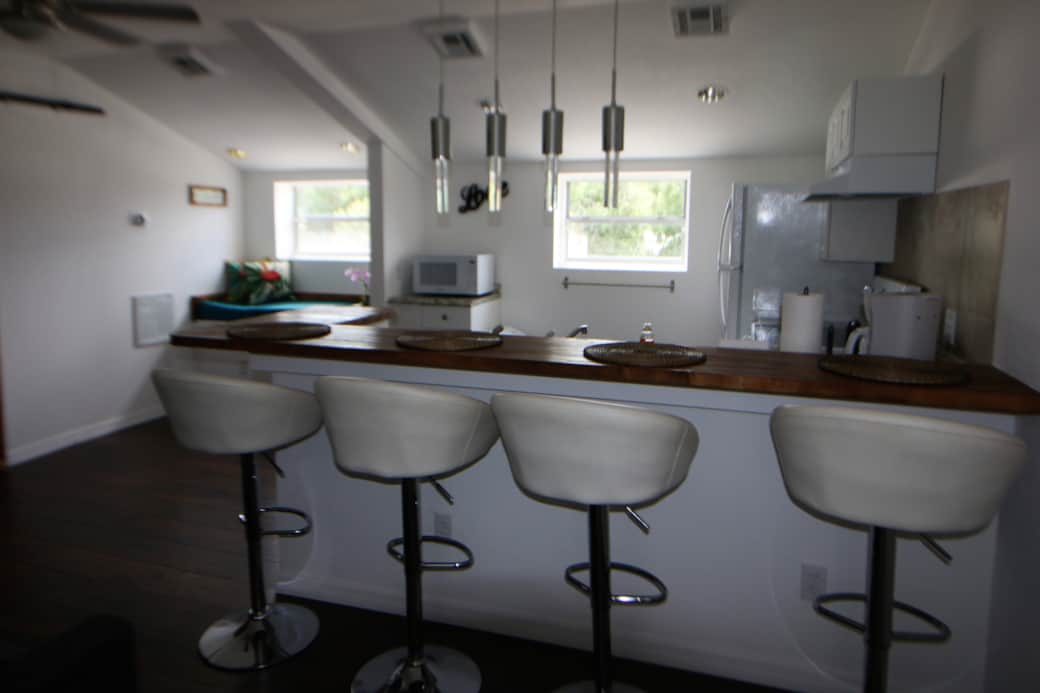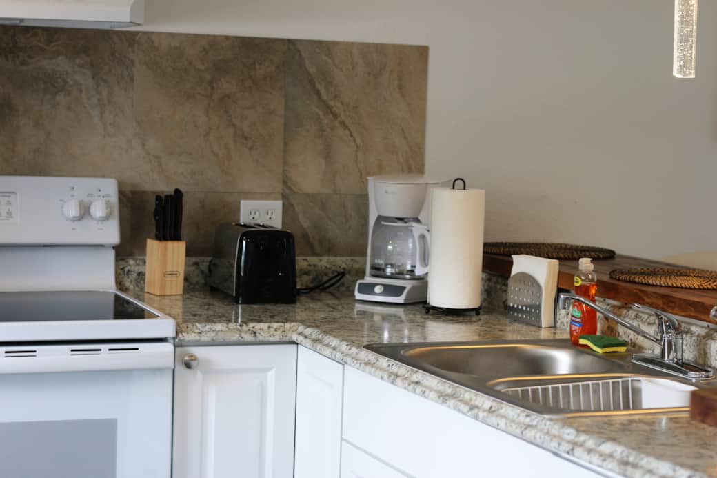 La cocina esta totalmente equipada con estufa, horno, microondas, refrigerador, cafetera, vasos, platos, cubiertos y todo para cocinar y servir tus recetas favoritas. Pero si no deseas cocinar puedes ir a los restaurantes y supermercados que están a solo 1 milla de distancia.